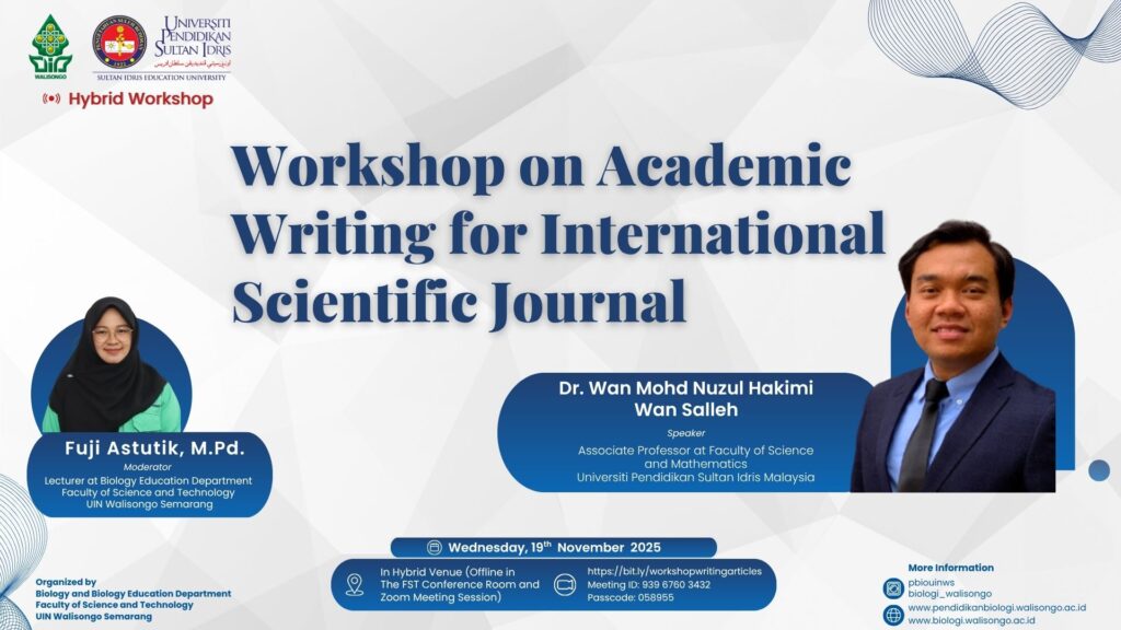 Semarang, 19 November 2025, Jurusan Biologi Fakultas Sains dan Teknologi UIN Walisongo Semarang mengadakan Workshop on Academic Writing for International Scientific Journals di Ruang Microteaching Laboratorium Terpadu secara hybrid. Kegiatan ini bertujuan meningkatkan kemampuan dosen dalam menulis dan mempublikasikan artikel di jurnal bereputasi internasional.
